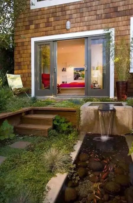 后院,家人最喜欢的活动空间,仅仅绿植和木平台显然不够。加一条叠水小溪流,池子里铺满鹅卵石,看着凸起的野草,听着哗啦啦的水流响起,宛如走进山水田园。